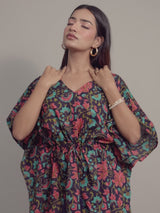 Floral Motifs on Black Cotton Kaftan Top Pant Set