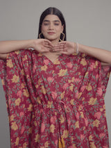 Floral Motifs on Maroon Cotton Kaftan Maxi Dress