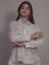 Tropical Print on White Cotton Shirt Set for Women